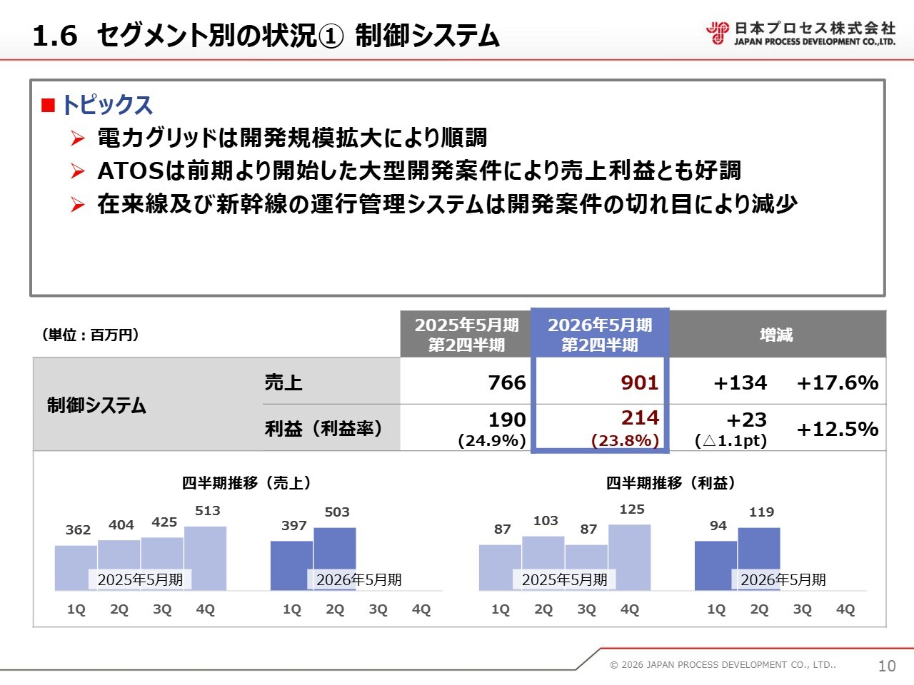 セグメント別の状況についてご説明します。まず、制御システムについてです。電力グリッドは開発規模の拡大により順調に推移しました。「ATOS」はJR東日本の東京圏輸送管理システムのことですが、前期から開始した大型開発案件により、売上利益とも好調でした。