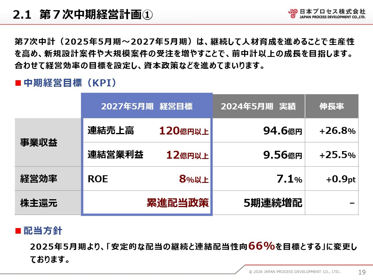 また、株主還元については、これまでも連続して増配してきましたが、あらためて累進配当政策とします。なお、配当方針については、2025年5月期より連結配当性向を66パーセントに高めています。