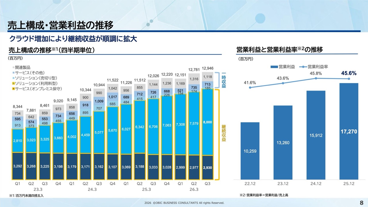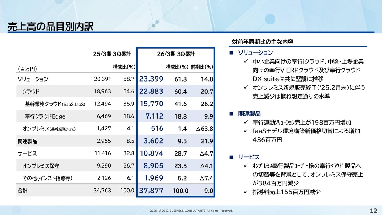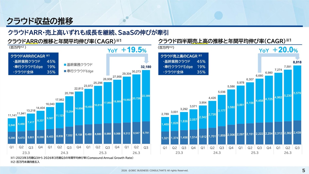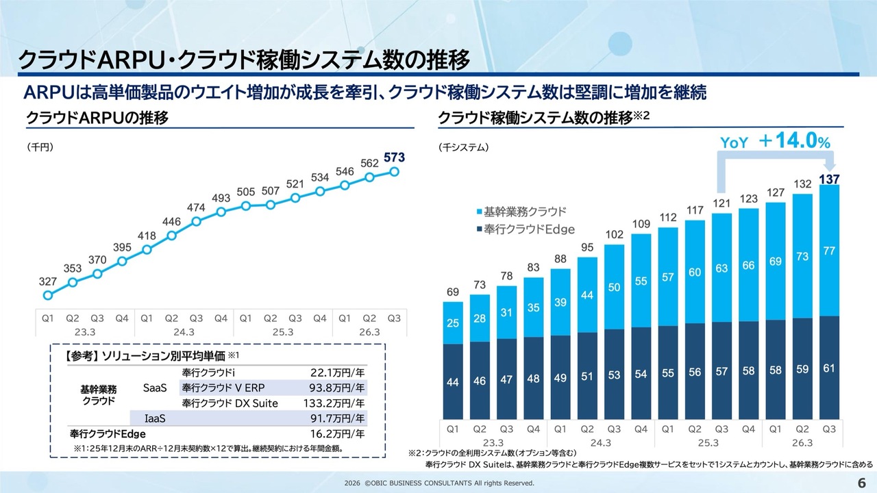 中小企業向けの「奉行iクラウド」の売上が堅調に推移し、中堅上場企業向けの「奉行V ERPクラウド」や「奉行クラウド DX Suite」の伸びが加速していることが、クラウド売上の拡大に寄与しています。