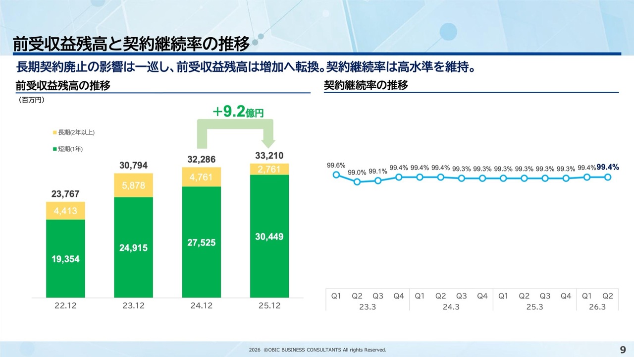 左側のグラフは前受収益残高の推移を示しています。OBCでは、新規契約や契約の継続更新をしていただく際に、1年契約であれば1年分、2年契約であれば2年分、5年契約であれば5年分といったように、契約期間分の利用料や保守料金の総額を一括前払いでお受けしています。