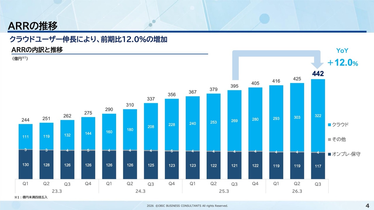 ARRとクラウドARPUは、この1年間でいずれも増加しました。ARRが442億円、クラウドARPUが57万3,000円となっています。