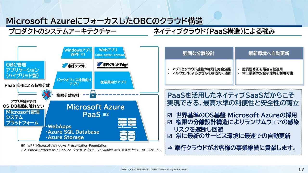 「奉行クラウド」がランサムウェアの感染を受けない構造となっているポイントについて、いくつかご説明します。まず、スライド左の図の土台部分に「Microsoft Azure」がPaaSであると記載されています。