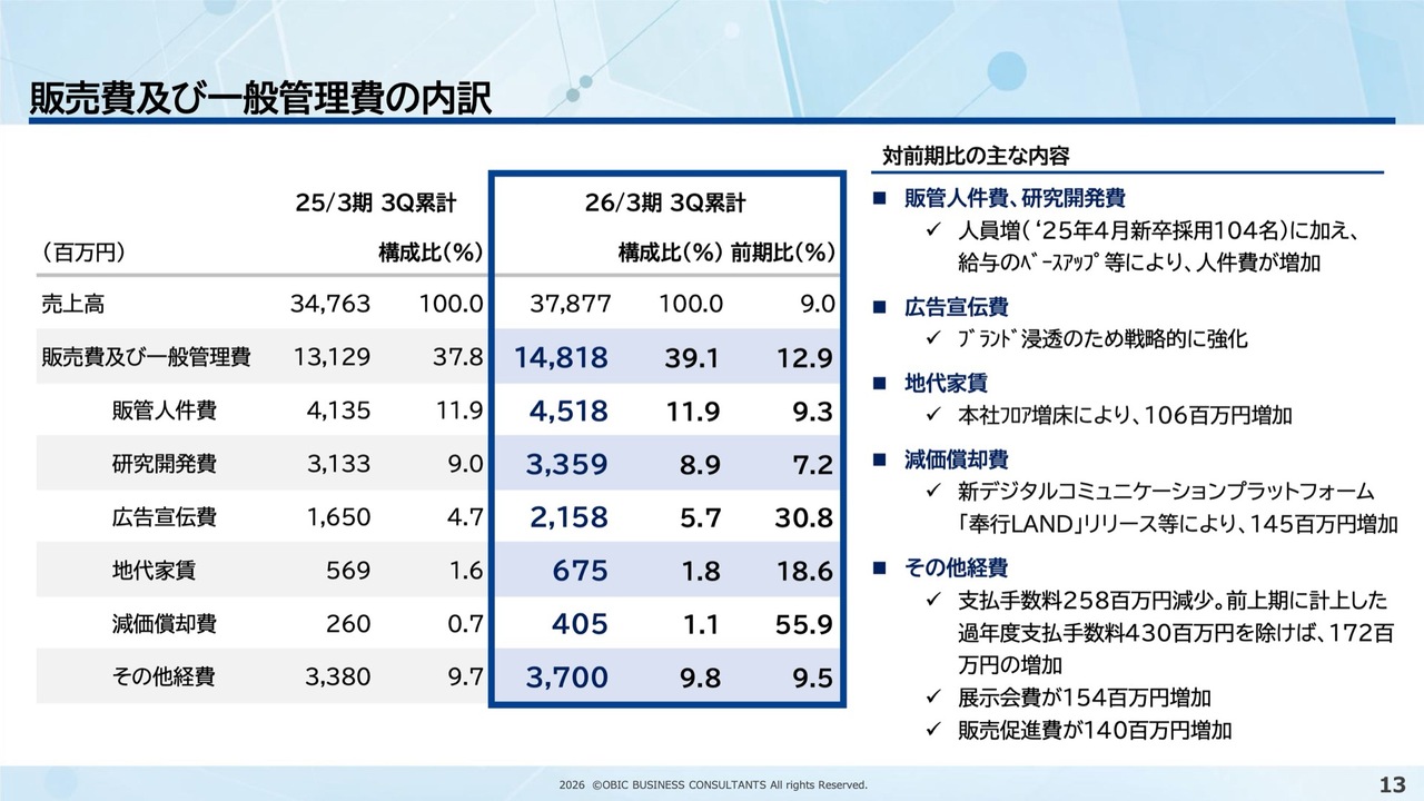 販管人件費の45億円余りと研究開発費の約33億6,000万円を合わせ、合計額は約79億円弱となり、この部分で前年同期比9パーセント弱の増加となっています。これらの増加要因としては、新卒採用104名による人員増加、給与の増額改定、残業単価の見直しが挙げられます。
