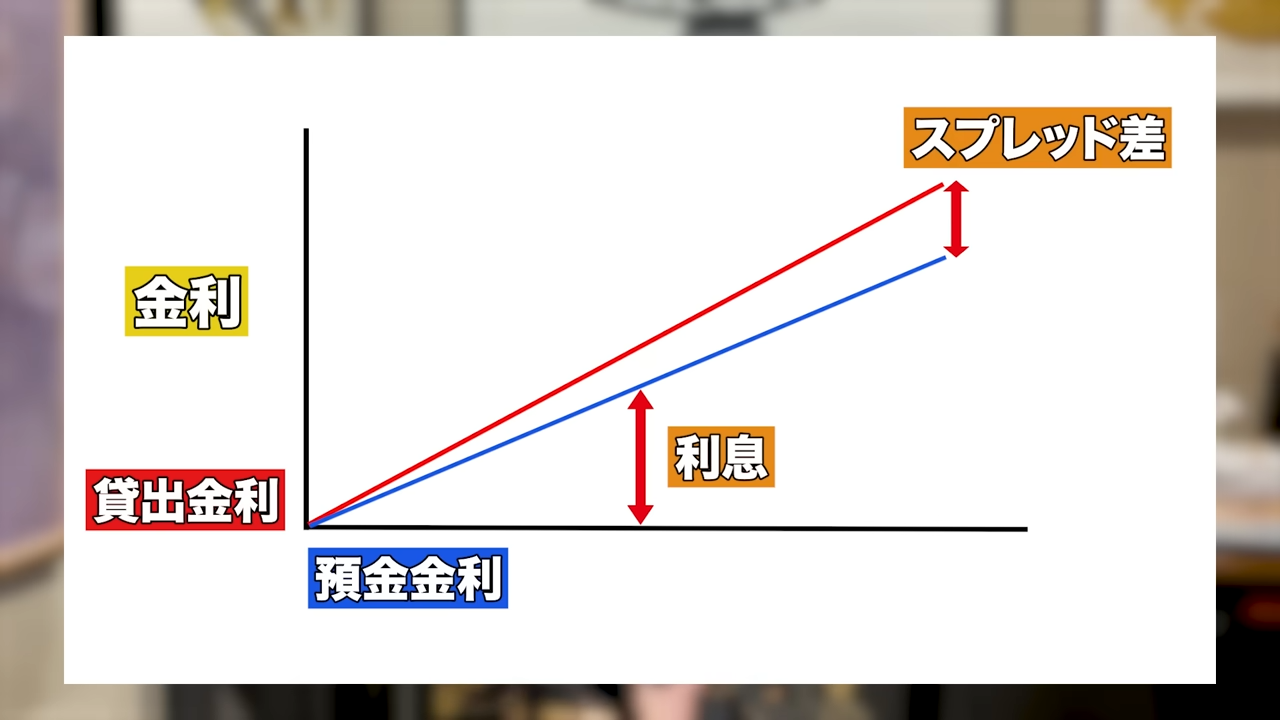銀行は、私たちのような一般国民から安い金利で預金を集め、それを企業などにより高い金利で貸し出すことで、その金利差(スプレッド)で稼いでいます。金利が上がっていくと、このスプレッドがどんどん広がっていくという考え方をします。もちろん私たちの預金金利も上がりますが、それ以上に企業への貸出金利はさらに上がるため、スプレッドが大きく拡大します。
