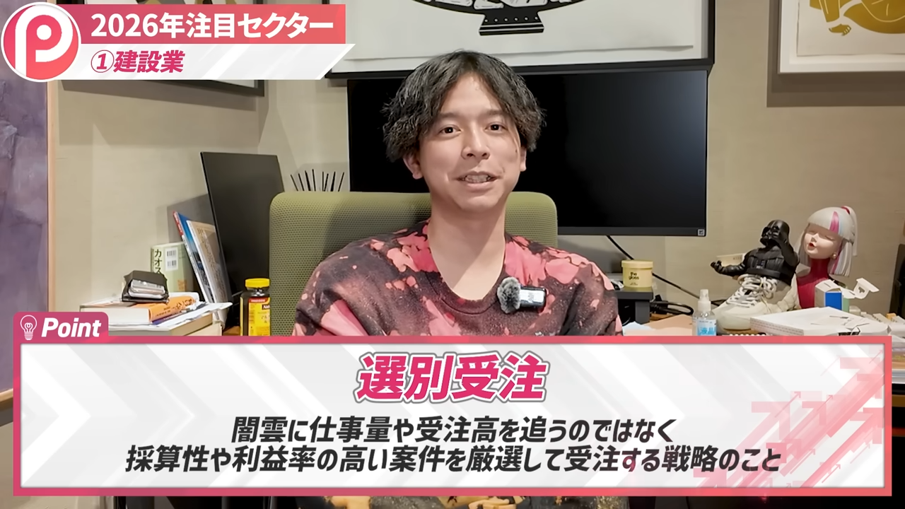 塩谷:1つ目は2026年に新規で来るというよりは、2024年、2025年からずっと続いているテーマです。建設業ですね。このチャンネルの視聴者の方なら「もう知ってるよ」という感じかもしれません。