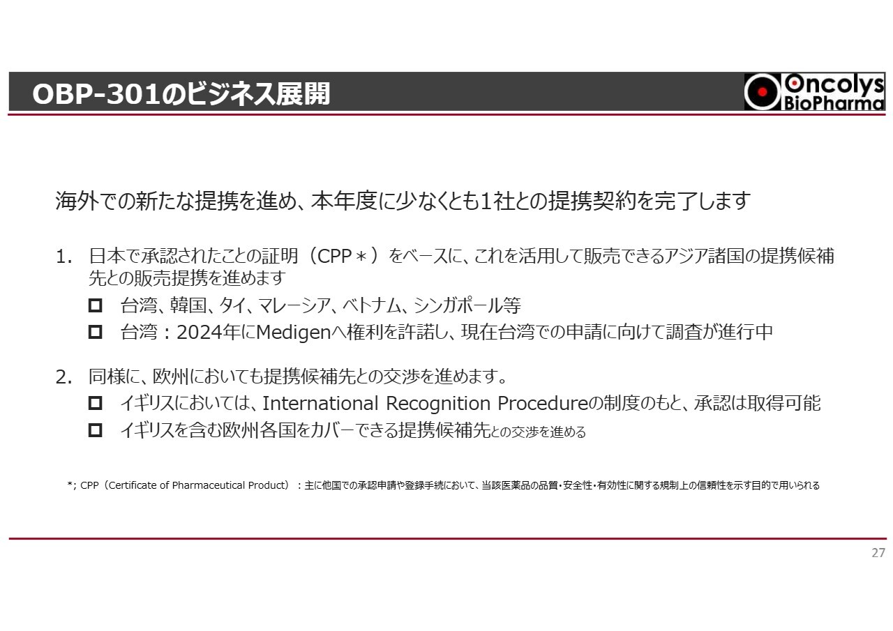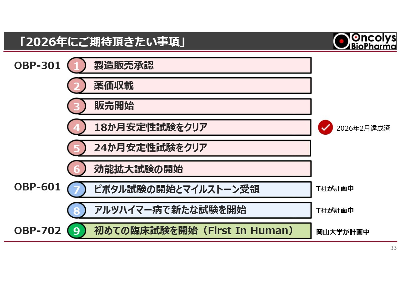 「OBP-601」については、昨年と同様の目標を設定しています。7番目に記載のとおり、少なくとも1つのピボタル試験、特にPSPのPhase3試験の準備が進捗しています。この試験についてはFDAも認識しており、開始できれば当社はマイルストーン収入を受領できると考えています。