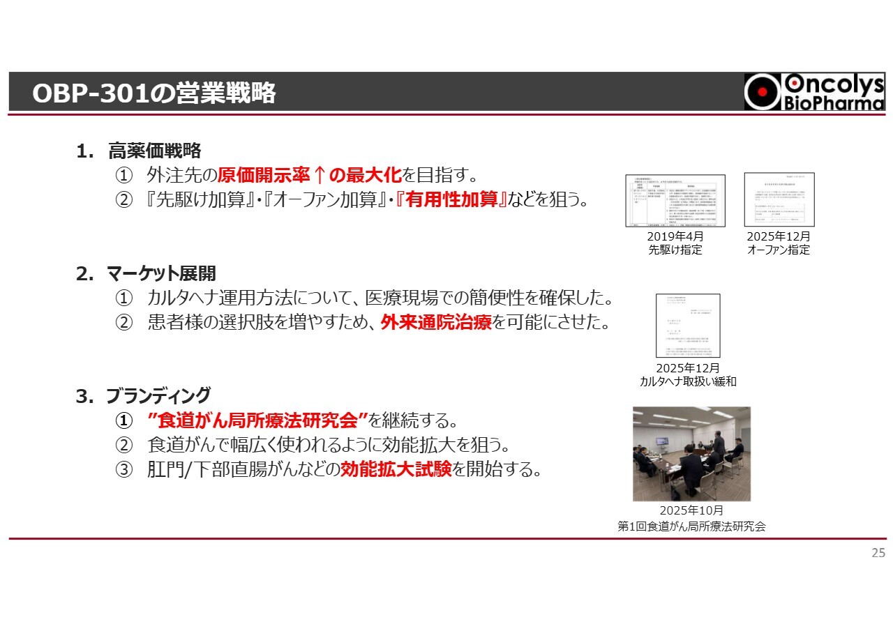これが達成できれば、おそらく夏から秋になる前には薬価収載に持ち込めるのではないかと考えています。この薬価収載については、食道がんの局所治療薬やアデノウイルス製剤は世界でもまだ存在しておらず、当社が初めて提供するものとなります。
