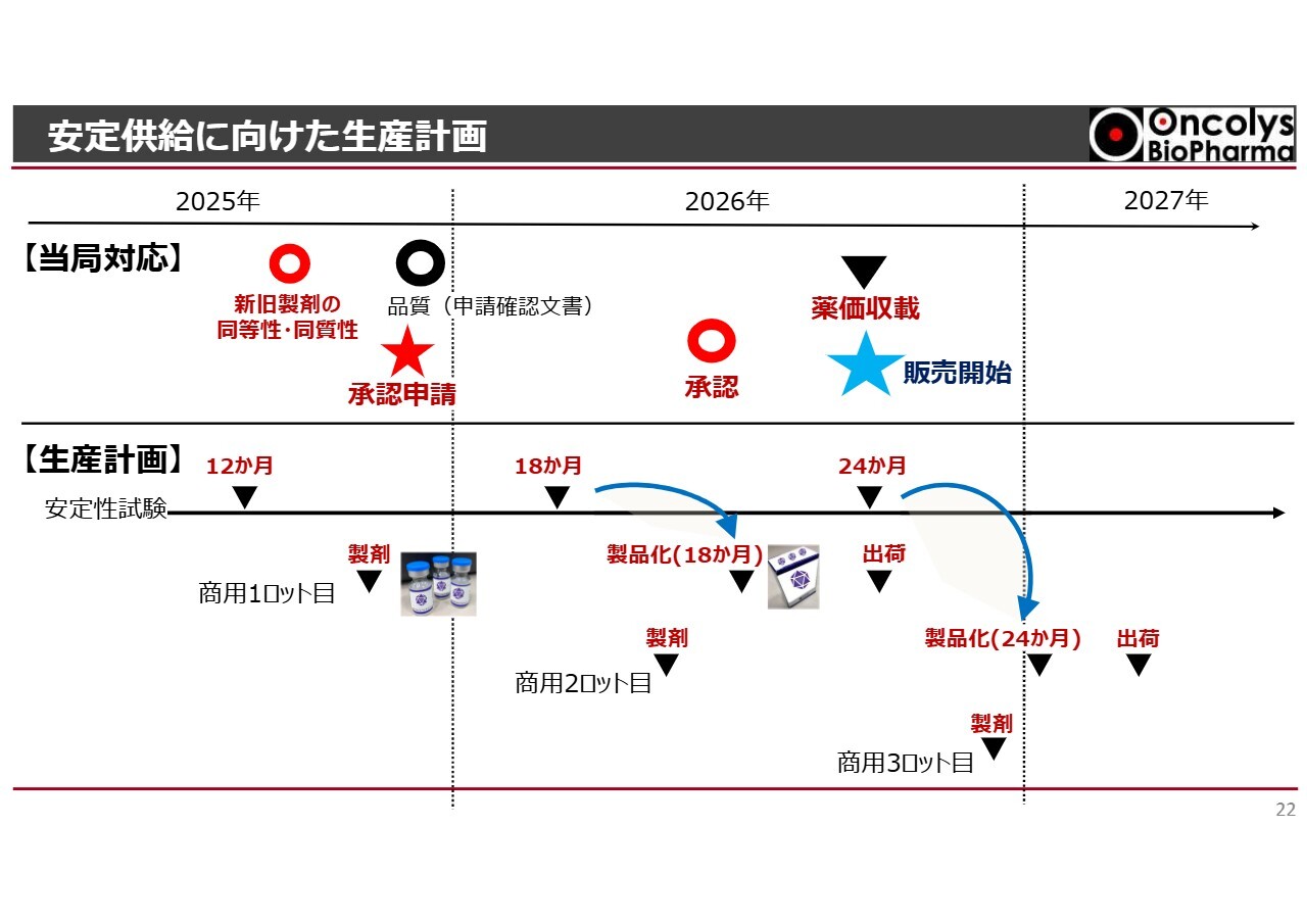 承認申請をしたことにより、2026年中頃に製造販売承認を得ることを想定しています。また、その数ヶ月後に薬価収載があり、販売が開始されるというスケジュールに基づいて、生産計画を立てています。