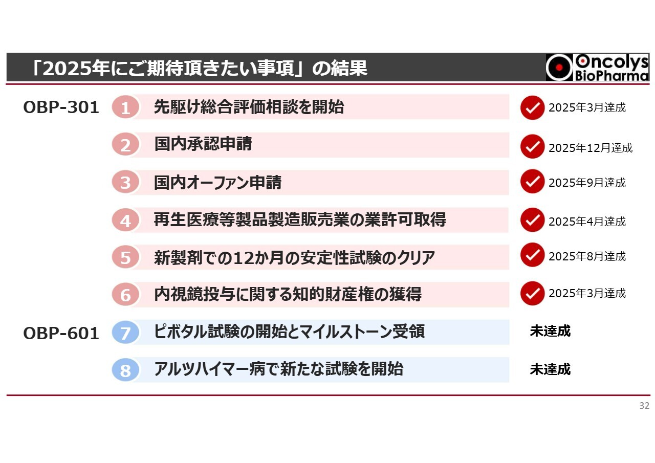 先ほど冒頭でもお話ししましたが、2025年にみなさまにご期待いただきたい事項に関して、「テロメライシン」についてはすべてクリアすることができました。