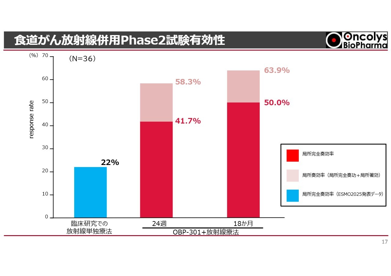 6番目に記載の効能拡大試験も開始します。これについては肛門がんや下部直腸がんを中心に、食道がんも対象としています。当社としては、フランチャイズ的な立場を確立したいと考えています。具体的には、化学放射線治療などによって一時的に消失したものの再発した食道がんに使用可能かどうかを検討しています。