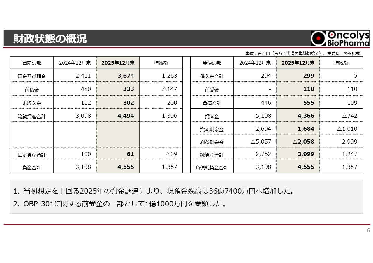 また、富士フイルム富山化学から前受金として1億1,000万円を受領しました。これらの結果、純資産は2024年12月末から12億4,700万円増加し、財務状況が改善しました。