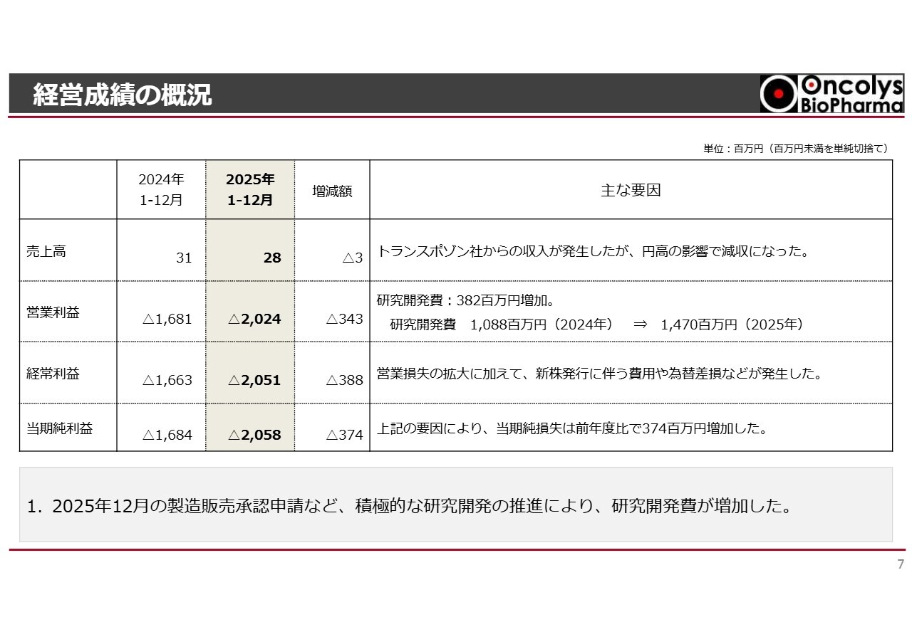 先ほど浦田から説明がありましたように、12月にはOBP-301の承認申請を行いました。研究開発を積極的に進めた結果、研究開発費が3億8,000万円強増加しています。