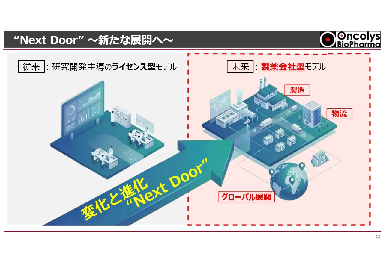 こうした取り組みに対して、当社は「Next Door」というスローガンを掲げ、「新しいドアを開け、新しいオンコリスに向かっていこう」ということで、全社一丸となって努力していきたいと考えています。