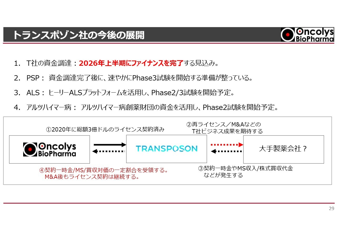 このような状況から、将来良い結果が得られた場合には、Transposon社が大手製薬企業に再ライセンスを行う可能性や、M&Aという選択肢も考えられます。
