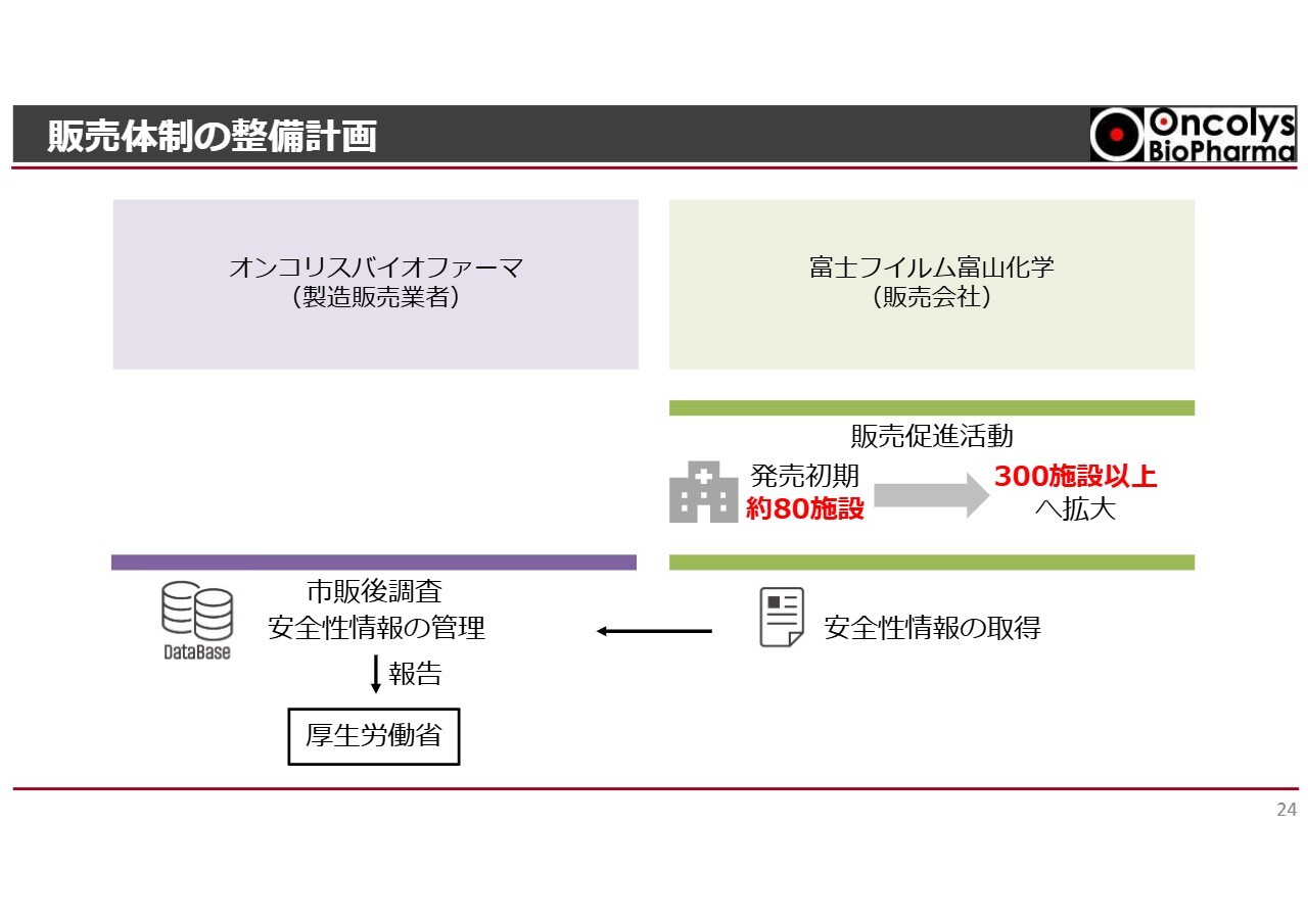 販売体制の整備計画についてご説明します。当社オンコリスバイオファーマは、製造販売業者として「テロメライシン」を発売する予定です。先ほどのスライドで示したとおり、富士フイルム富山化学と販売提携契約を結び、医療機関への配送は販売会社である富士フイルム富山化学が担当します。