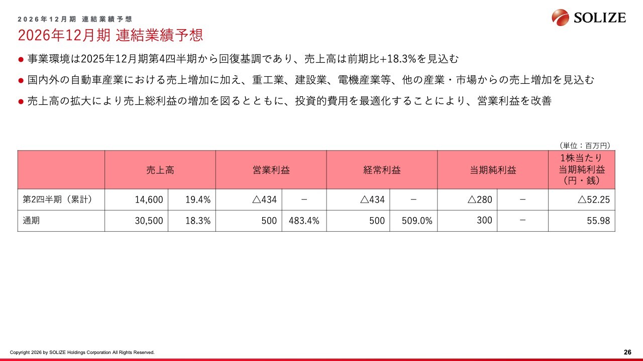 2026年12月期の連結業績予想です。売上高は前期比18.3パーセント増の305億円を見込んでいます。営業利益は昨年の8,500万円に対し、今年は5億円を予想しています。我々は収益回復基調に乗っていき、利益を確保していきます。経常利益は5億円、当期純利益は3億円を見込んでいます。
