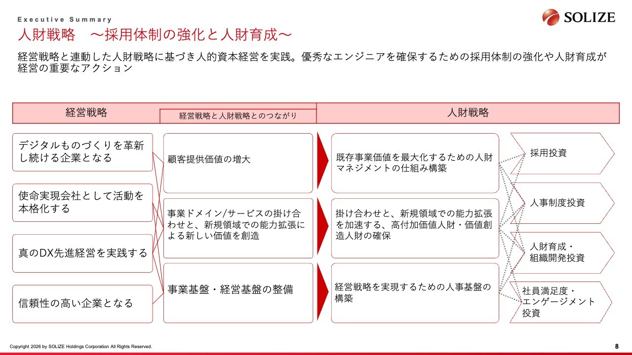 1つ目に、最大の母体であるSOLIZE PARTNERS株式会社では、主にエンジニアリング・マニュファクチュアリングの既存事業を中心に展開し、昨年は7パーセント弱の成長を遂げました。2つ目に、既存事業を中心とするコンサルティング・エンジニアリング事業は、約20パーセントの成長を達成しています。