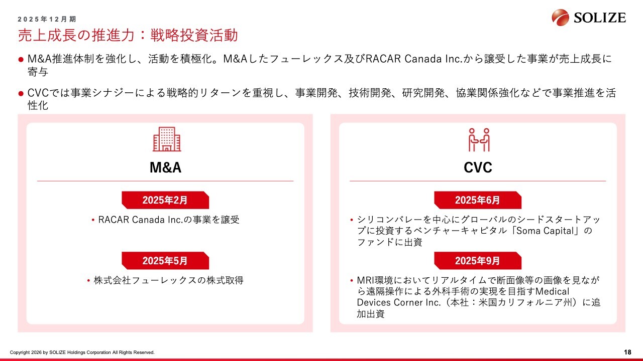 投資戦略についてです。M&Aとしてはカナダに進出し、株式会社フューレックスについては先ほど触れたとおりです。また、CVCではシリコンバレーのSoma Capital Management LLCに出資し、シナジーによる架け橋となることを見据えた投資を行っています。