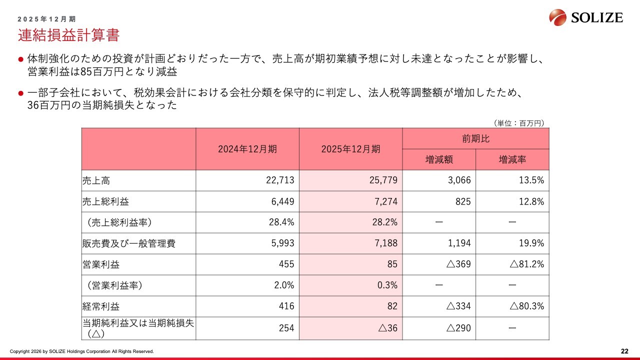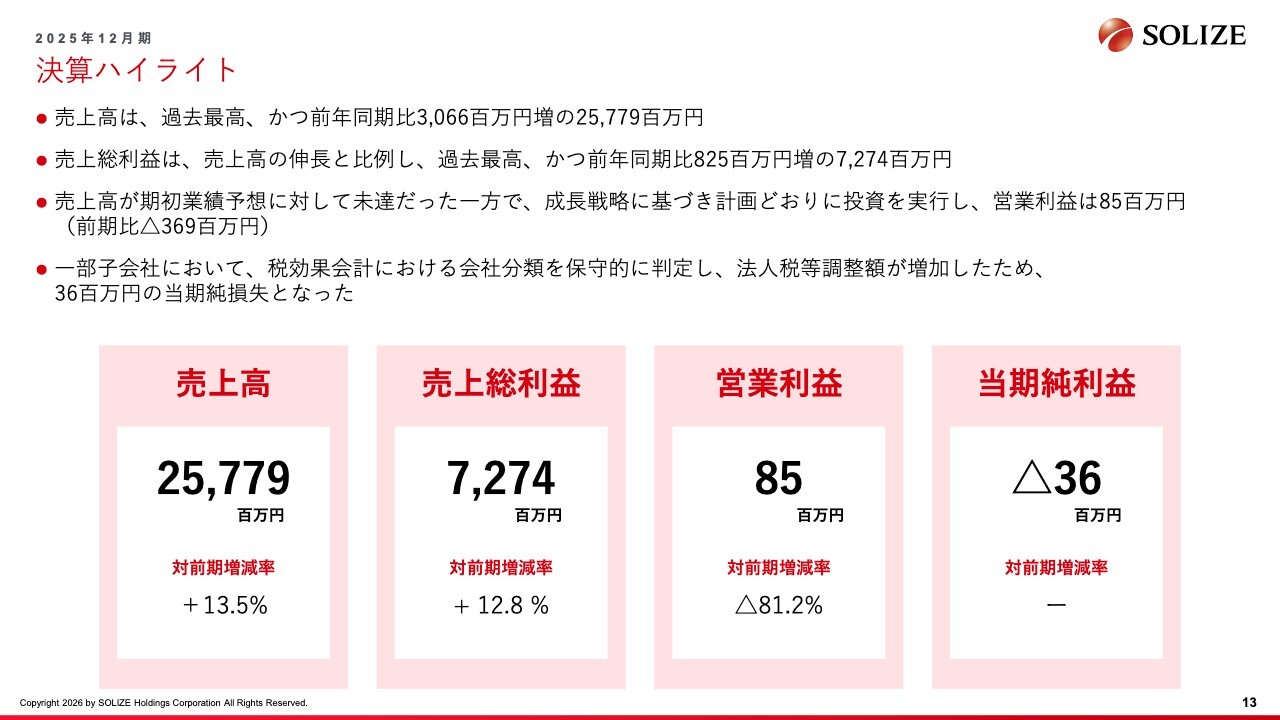 損益計算書の中身についてです。2025年12月期の売上高は前期比13.5パーセント増、売上総利益は前期比12.8パーセント増となりました。