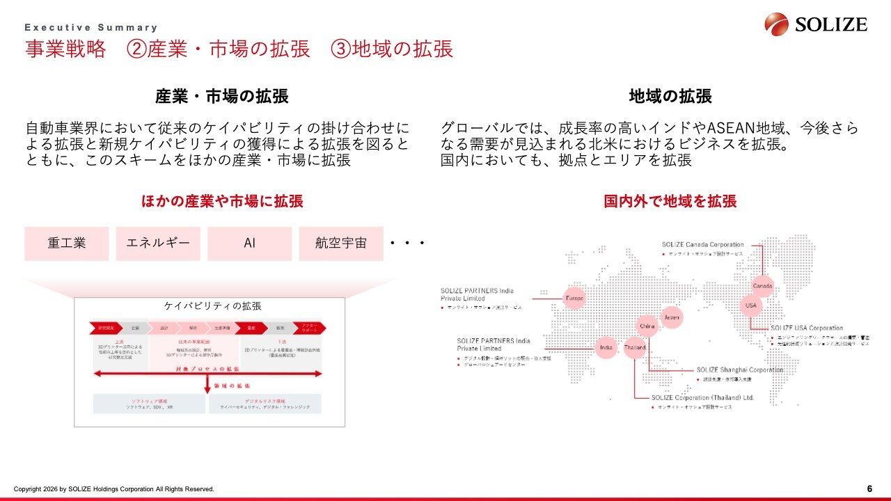 市場の拡張については、我々はもともと自動車産業に強みを持っていましたが、新たに二輪事業にも進出しています。地域の拡張としては、先ほどご説明した部分に加え、東海地域の株式会社フューレックスや、北米、タイへの進出も進めています。