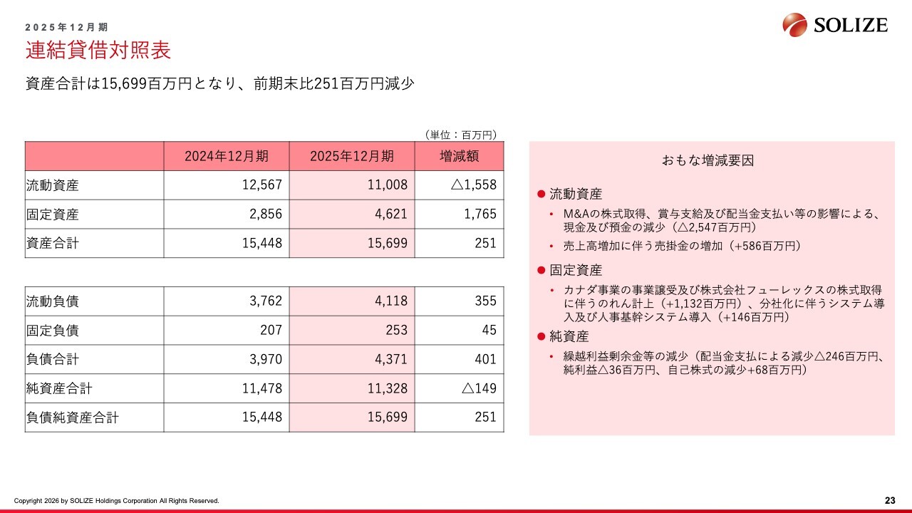 貸借対照表です。M&Aによりカナダの事業および株式会社フューレックスをグループに加えた結果、流動資産から固定資産に資金が移動しています。純利益については、配当金の支払いなどにより繰越利益剰余金が一部減少しています。