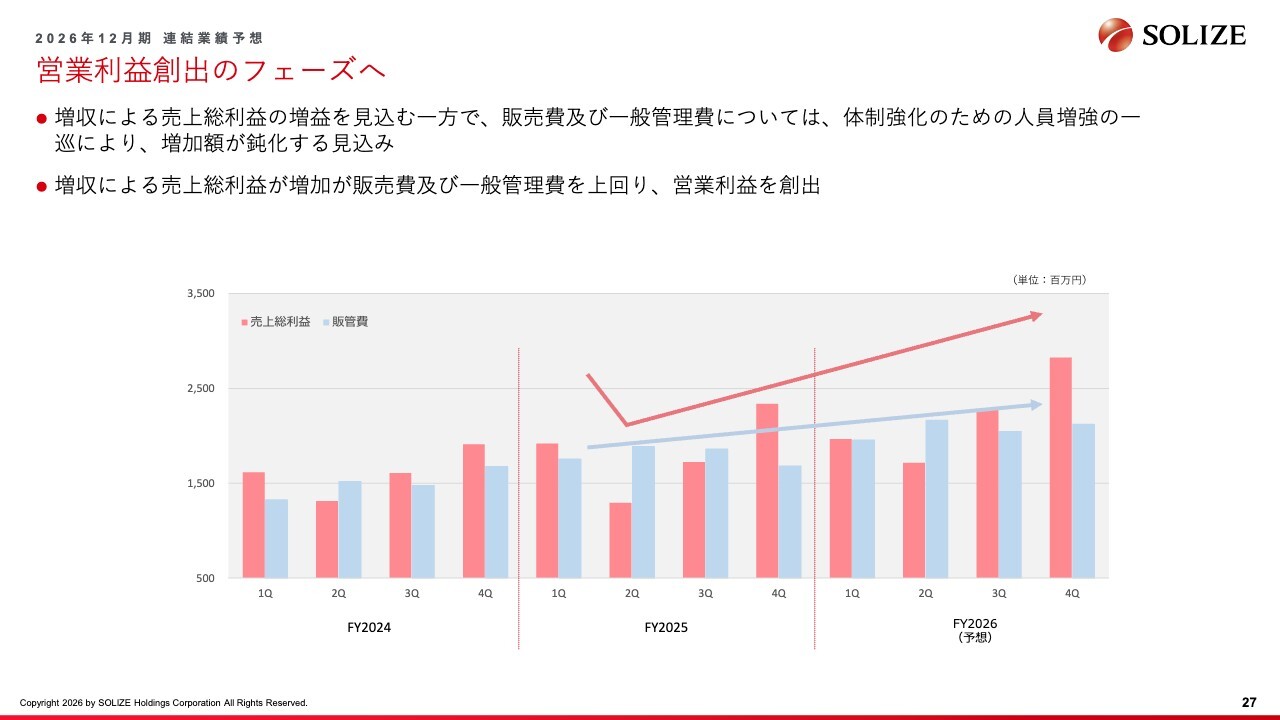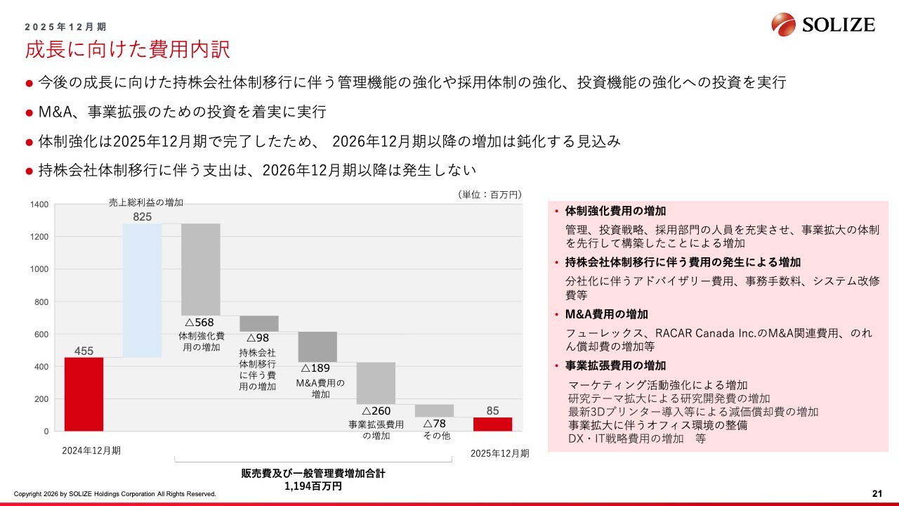 2026年12月期においては、事業成長のためのM&A費用や事業拡張に向けた拠点開設などの費用が一定程度発生します。ただし、体制強化は持株会社化を含めてほぼ完了しているため、今期以降はその費用の増加は鈍化すると考えています。