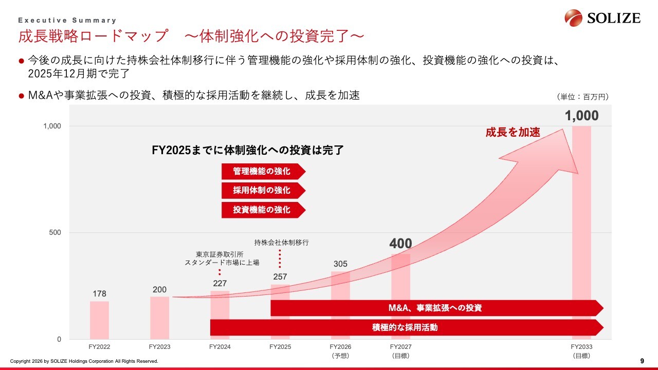 売上高1,000億円規模の企業体を目指すために、まずは500億円から600億円規模の体制を確立するための先行投資が2025年12月期に完了しました。ホールディングス化が実現し、体制が整ったため、ここから一気に成長を加速させていきます。