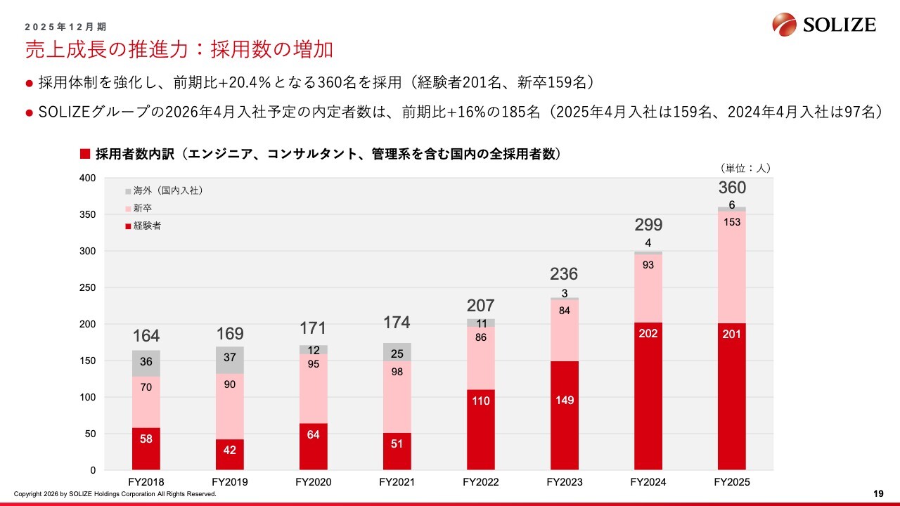 一方、粗利と販管費の関係については、これまで体制強化と事業の成長を同時に進めてきたため、一定の投資費用が発生していましたが、2025年12月期に体制強化が終わりました。そのため、これ以上大きな費用をかける必要がなく、さらに季節性を考えると、第3四半期から第4四半期にかけて200名近い新卒採用者の稼働が上がっていきます。これにより粗利と販管費の差が生まれていく構造を継続できるため、徐々に収益を回復していけると考えています。