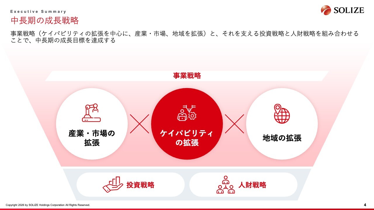 中長期の成長戦略を掲げる中で、大きく5つのポイントがあります。まず、事業戦略としては「ケイパビリティの拡張」「産業・市場の拡張」「地域の拡張」が挙げられます。また、事業戦略を支える2つの戦略として、「投資戦略」と「人財戦略」があります。これら3つの拡張と2つの戦略が当社の成長戦略です。