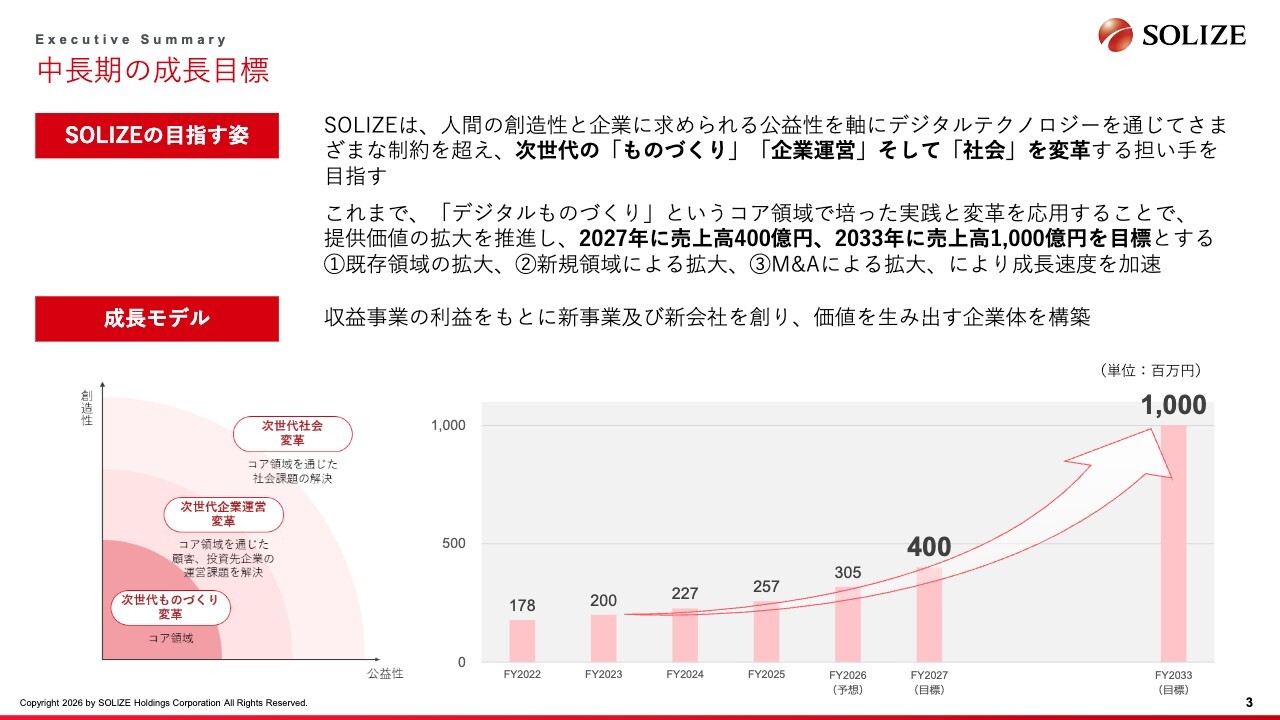 エグゼクティブサマリーです。当社は2024年2月に上場しました。上場時点で売上高は200億円を超えていましたが、さらなる成長を目指し、2033年に売上高1,000億円の企業体を目指すという中長期の成長目標を掲げています。