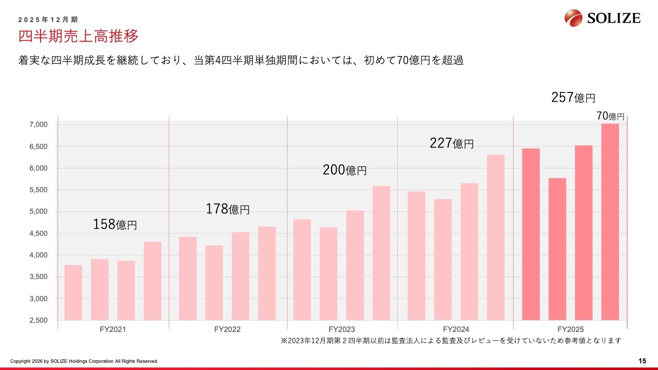 ただし、これはあくまでも一時的な問題であり、2025年12月期第4四半期には徐々に回復傾向となっています。その結果、おかげさまで四半期として初めて70億円を超える売上高を達成することができました。