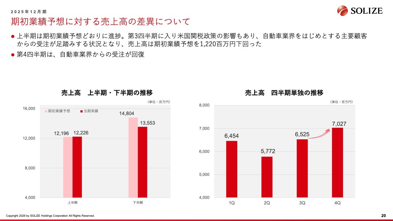 しかし、第2四半期からトランプ政権による関税問題の影響を受け、顧客である自動車産業の受注が滞りました。この影響は第3四半期にかけて大きく表れ、結果的に下期の業績予想を大きく外し、粗利が減少したことに伴い営業利益も下がりました。