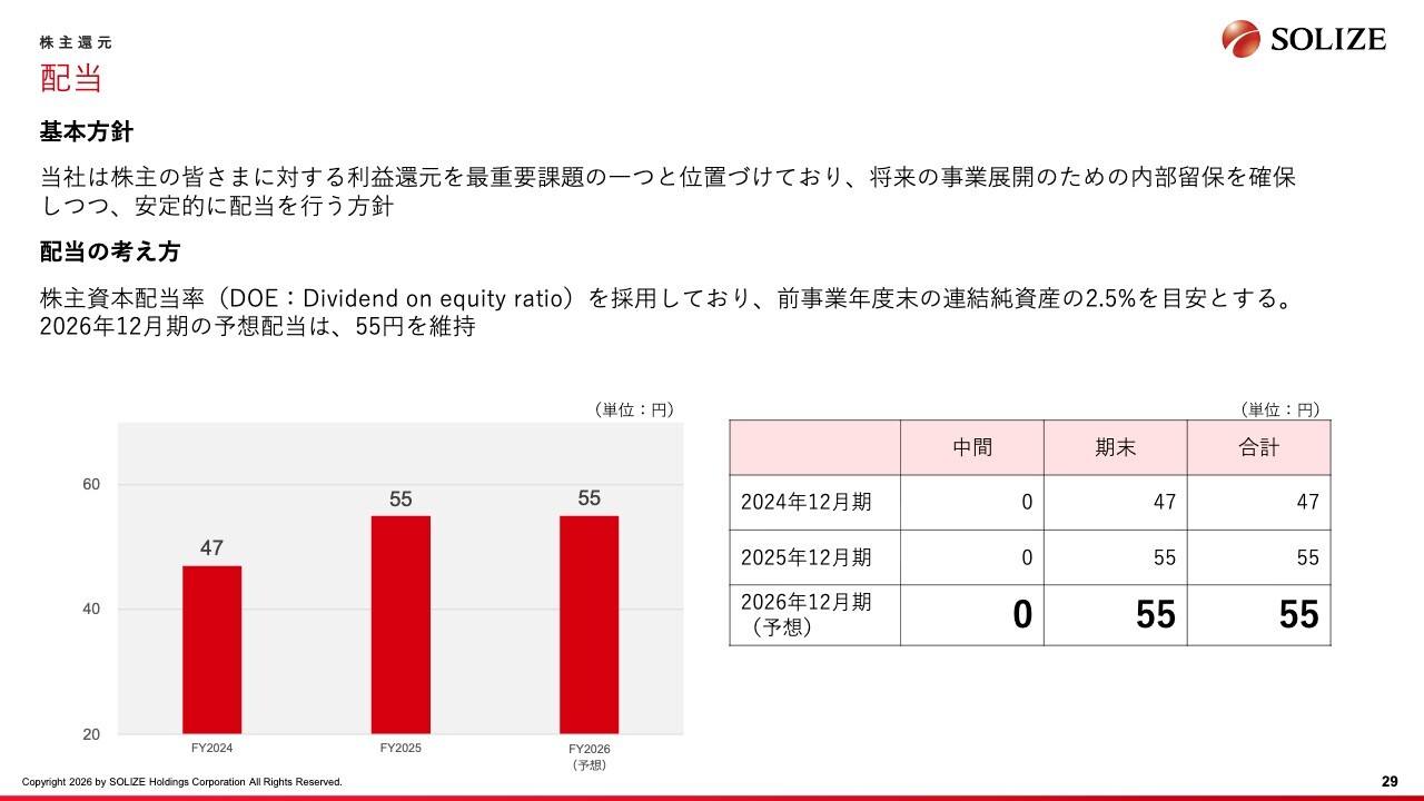 株主還元についてです。2026年12月期も55円の配当を維持する方針です。私どもとしては、株主のみなさまとの関係性においても一時的なボラティリティを反映するのではなく、中長期の成長をともに推進し、その成果を共有できるよう、還元を継続していきたいと考えています。