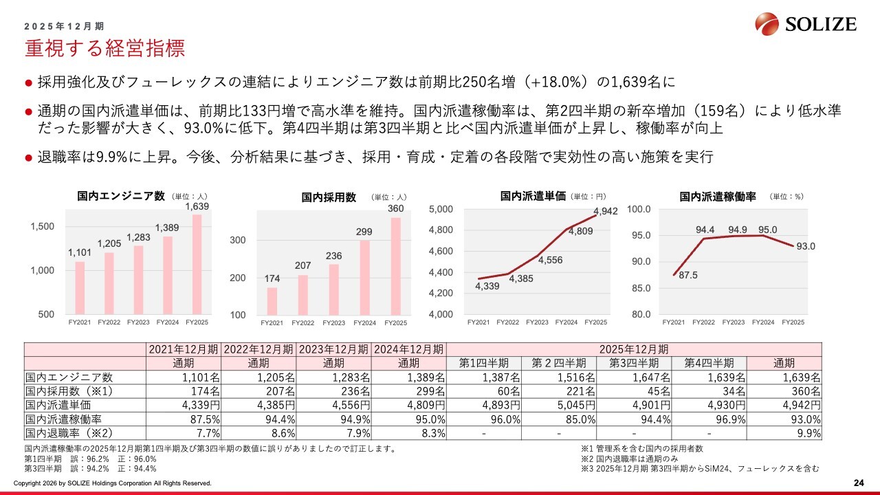 四半期ごとに見ると、第2四半期は新卒が入社するタイミングやゴールデンウィークの影響で一時的に稼働が抑えられるかたちとなり、売上が下がる傾向があります。しかし、第3四半期から第4四半期にかけては新卒の稼働も高まり、売上が伸びるため、2025年12月期第4四半期は当社として初めて70億円を超える売上高を達成しました。