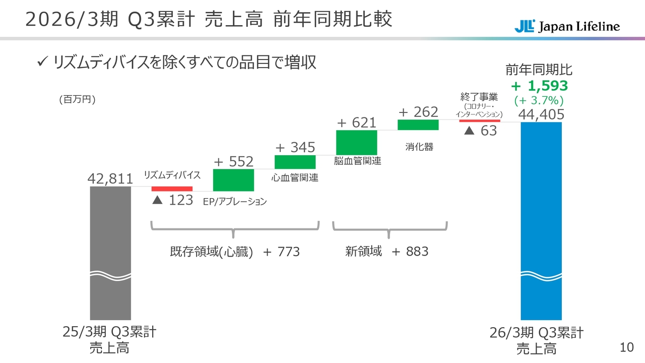 リズムディバイスを除くすべての品目で増収を達成しました。特に、既存領域である心臓領域のEP/アブレーションおよび脳血管関連での増収が大きく寄与しています。