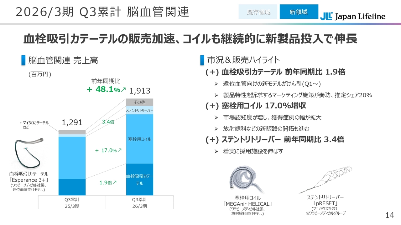 ステントリトリーバーも堅調に伸びています。現状は透視マーカーがない旧モデルを販売していますが、今年3月に透視マーカー付きの新製品をリリースする予定です。このマーカー付き新製品の登場により、脳血管領域における新たな成長の主要な牽引役となることを期待しています。