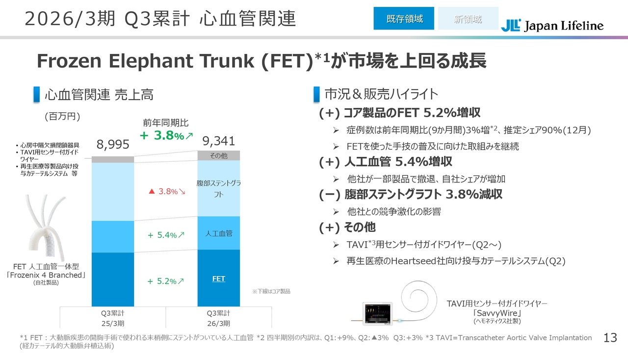 心血管関連の業績についてです。売上高は93億4,100万円、前年同期比3.8パーセントの成長となりました。「Frozen Elephant Trunk(FET)」が成長を牽引しています。