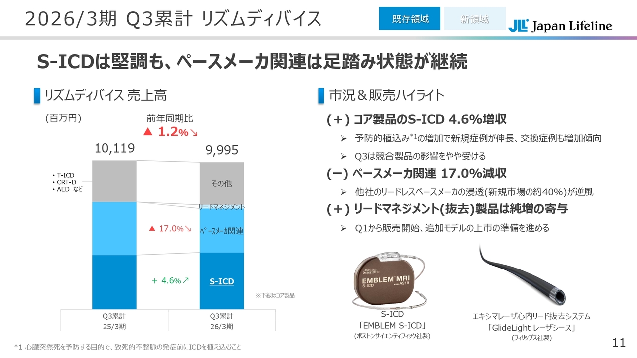 ハイライトを3点示しています。1点目はコア製品の「S-ICD」です。新規植込みの症例数は、予防的植込みの増加がドライバーとなり、当社調べでは1桁台後半の拡大傾向が見られます。交換症例も想定以上に増加しました。