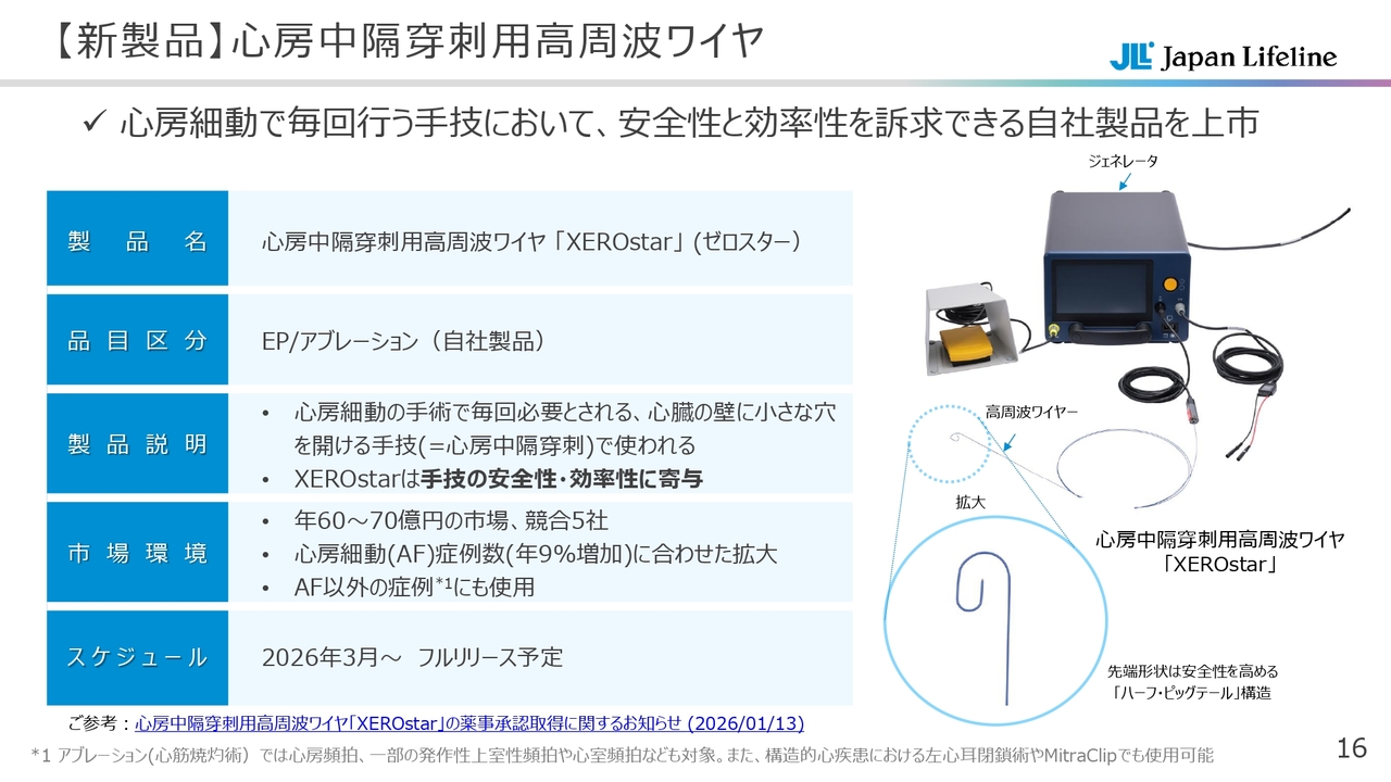 今年1月に当社が承認を取得した新製品についてご紹介します。こちらは、EP/アブレーションにおける自社開発商品の心房中隔穿刺用高周波ワイヤ「XEROstar(ゼロスター)」です。