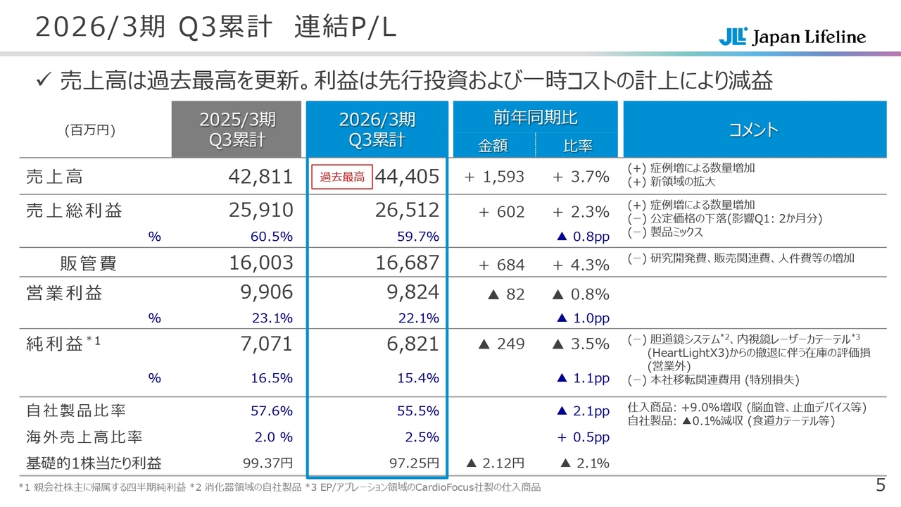 まず、決算ハイライトです。第3四半期の結果として、販売や研究開発などの先行投資はおおむね計画どおり進捗しています。営業外費用以下については、一時コストがかさんだ影響で、結果として増収減益となりました。