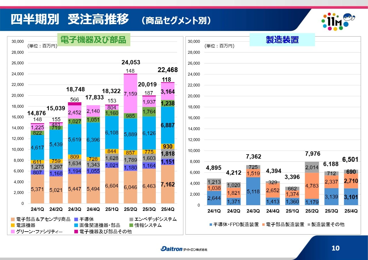 製造装置には投資の波があり、多少の変動はありますが、アジアを中心とした海外では受注が一服している状況です。一方、国内ではデータセンター向けの光デバイス関連設備機器の受注が非常に活況になりつつあります。これらが少しずつ寄与し、このような水準を維持できていると考えています。