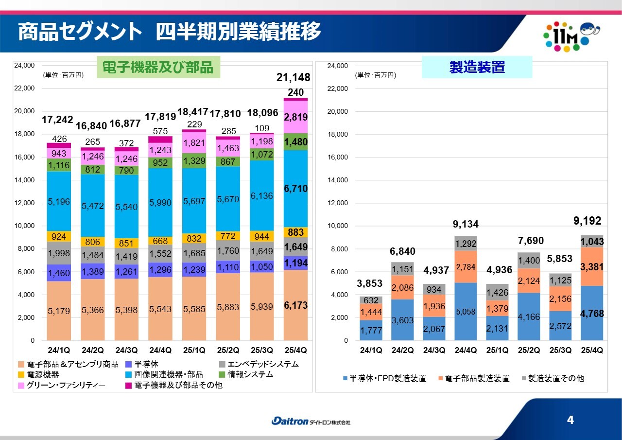 製造装置の数字も、順調に伸びています。具体的には、半導体のシリコン材料関連の設備や、一部データセンターにも関連する光半導体関連の設備などを、当社の強みとして提供しています。こちらが順調に売上を伸ばせたことにより、このような結果となりました。