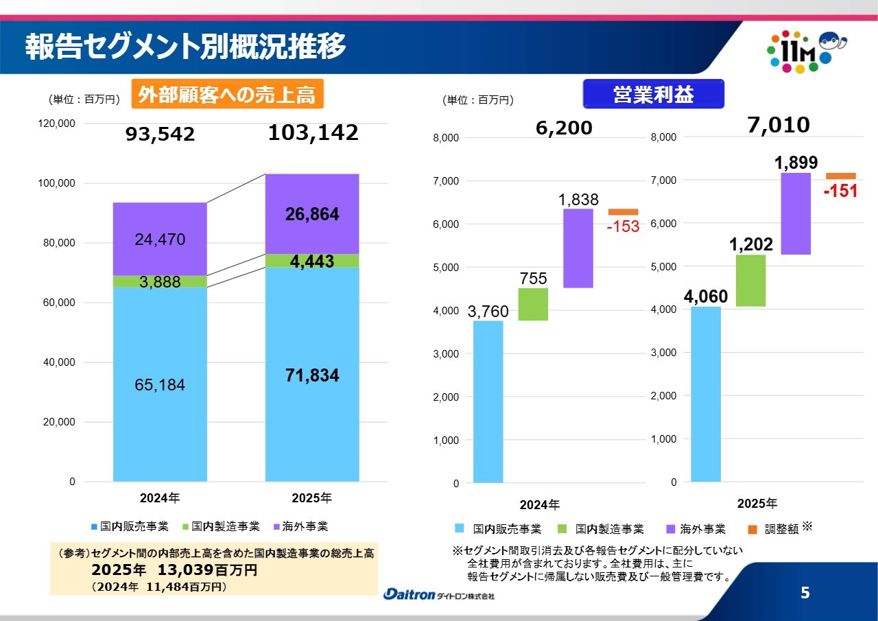 報告セグメント別の概況推移です。当社が報告するセグメントは、国内販売事業、国内製造事業、海外事業の3つです。3つの事業がいずれも前年比で増収増益となる、好結果を達成しました。
