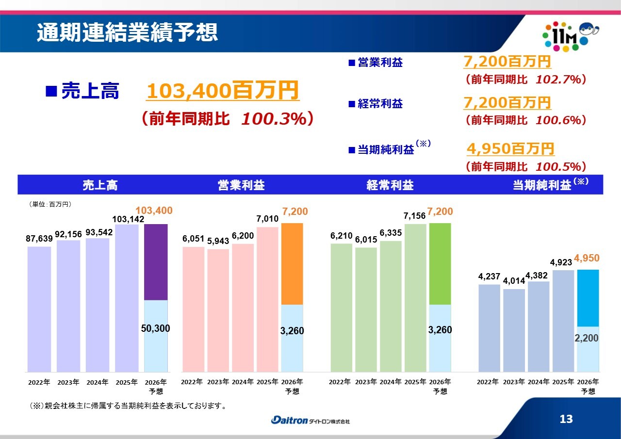 営業利益と経常利益はともに72億円を予想しています。営業利益は前年同期比102.7パーセント、経常利益は同100.6パーセントとなります。当期純利益は、前年同期比100.5パーセントの49億5,000万円を予想しています。