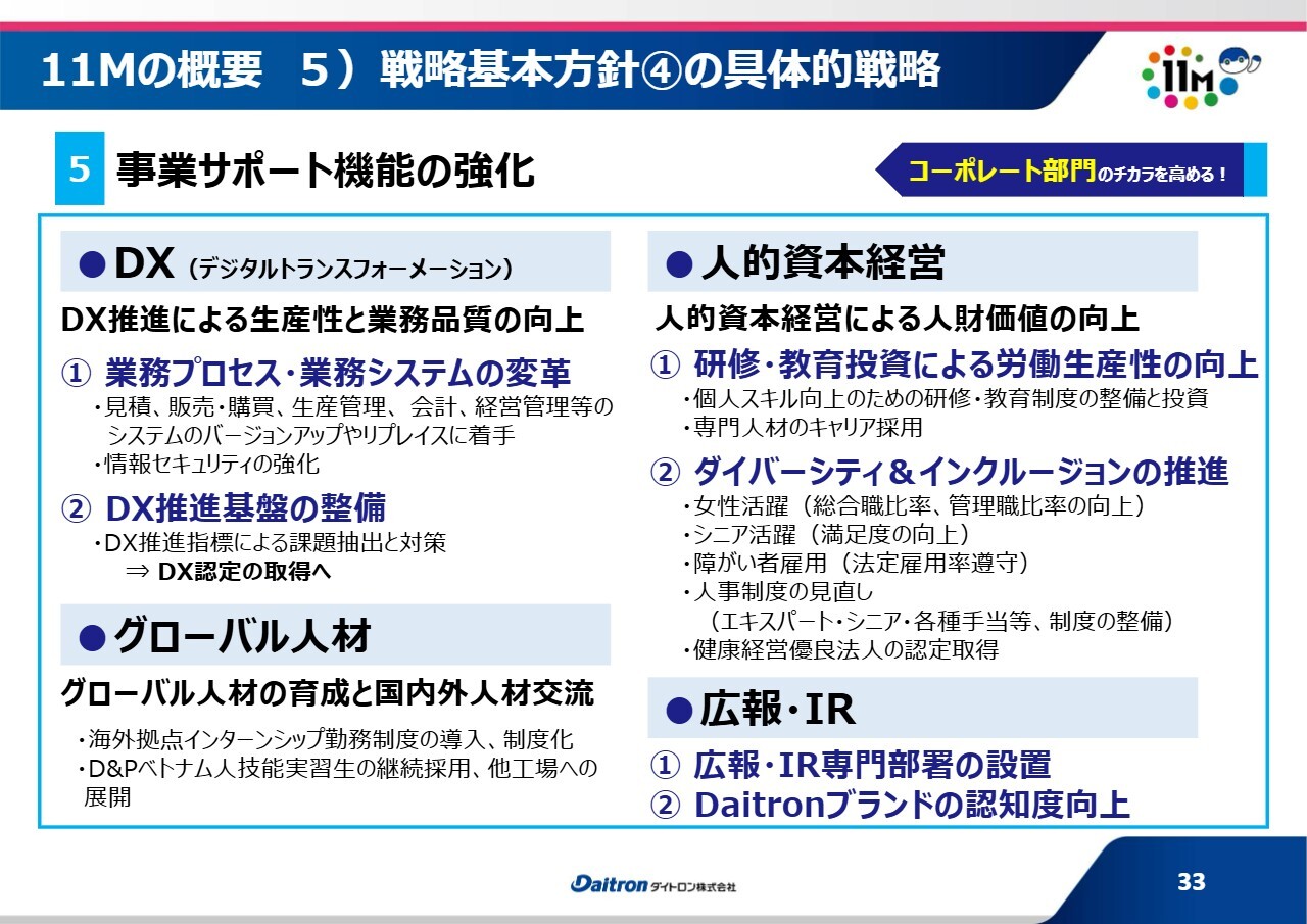 5つ目は、事業サポート機能の強化です。生産性の向上や日常業務での業務品質の向上を目指し、管理本部を中心にDXを推進しています。