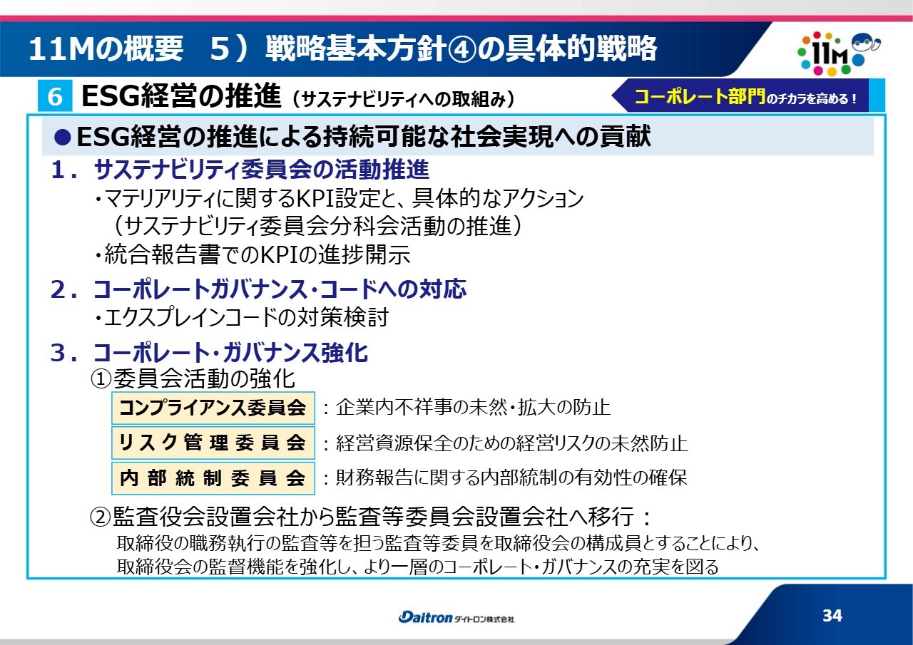 6つ目に、この中計からESG経営を推進しています。まだまだ勉強不足な部分もありますが、一つひとつ確実に取り組んでいる段階です。