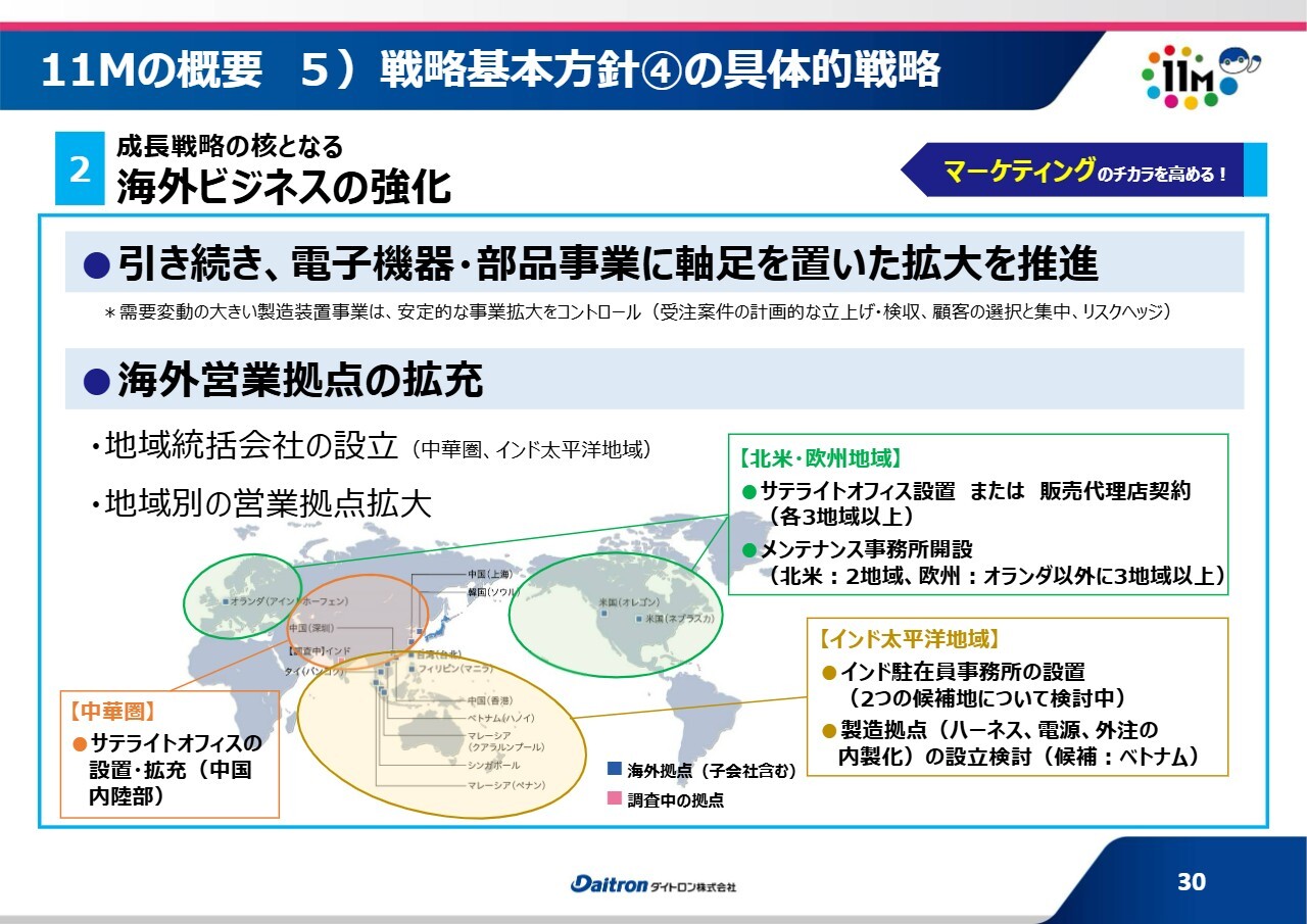そのためには、海外拠点の拡充が非常に重要であると捉えています。主要な市場としては中国、北米、ヨーロッパを想定しています。これらの地域にはすでに拠点がありますが、さらに出張所やサテライトオフィスを設けることで、「点」から「面」に近い営業活動が可能になると考えています。