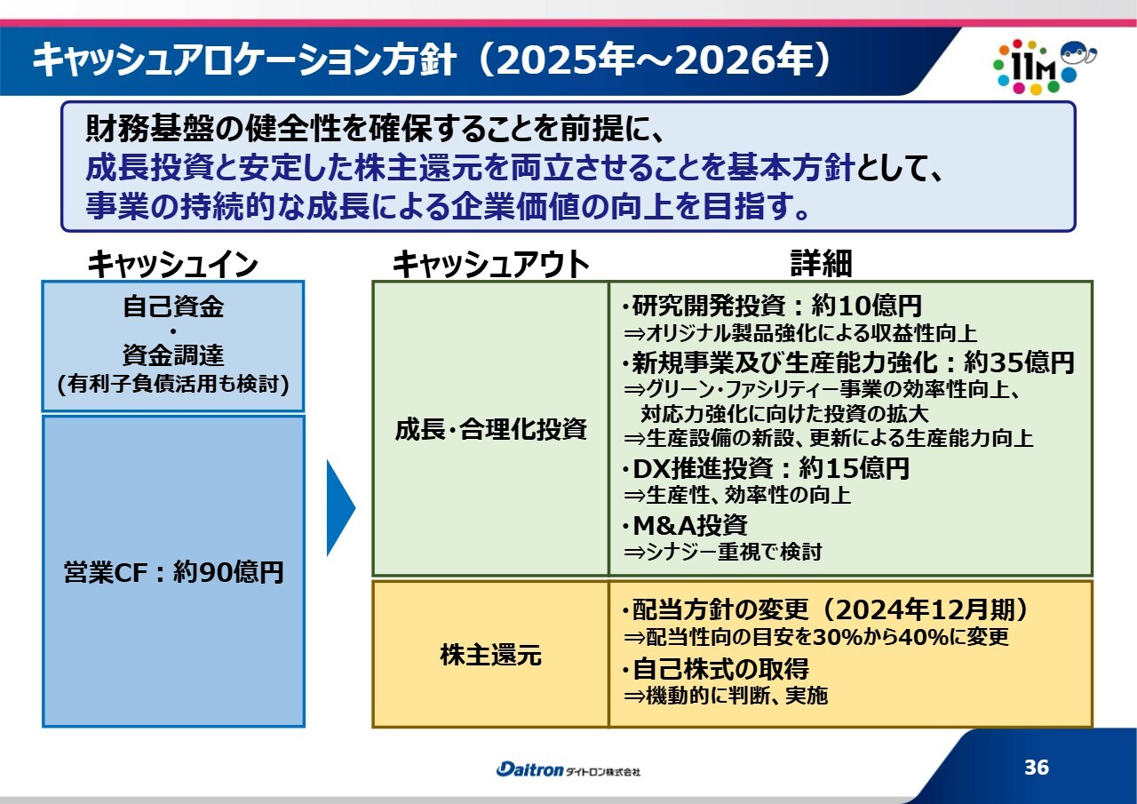 キャッシュアロケーション方針です。2025年から2026年末までを対象として、スライドに記載のとおり、さまざまな投資を検討しています。