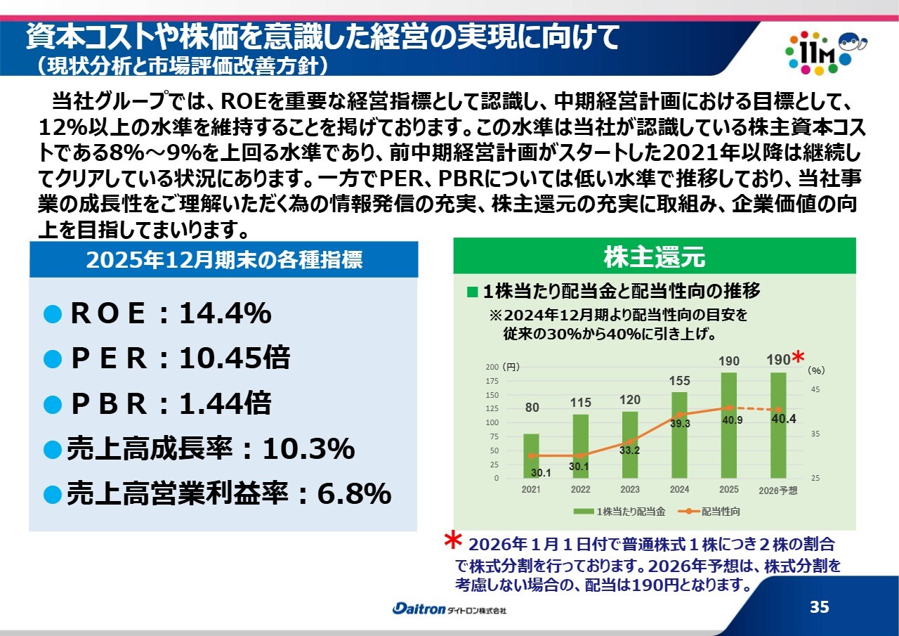 資本コストや株価を意識した経営を、当社としてもしっかりと行っていく必要があるという認識を持っています。また、株主さまへの還元は非常に重要であると考えています。