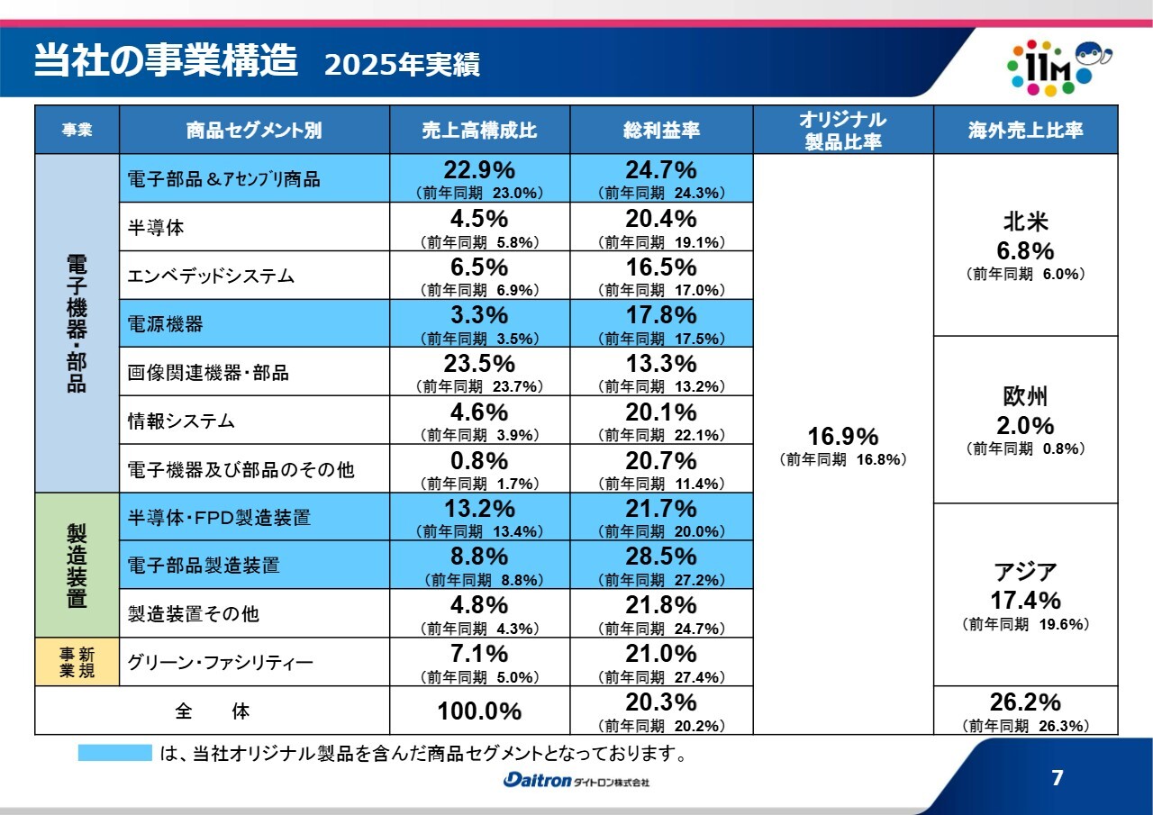 また、スライドの表の右側に記載のとおり、オリジナル製品比率は昨年とほぼ同水準です。海外売上比率にも大きな変化はありません。